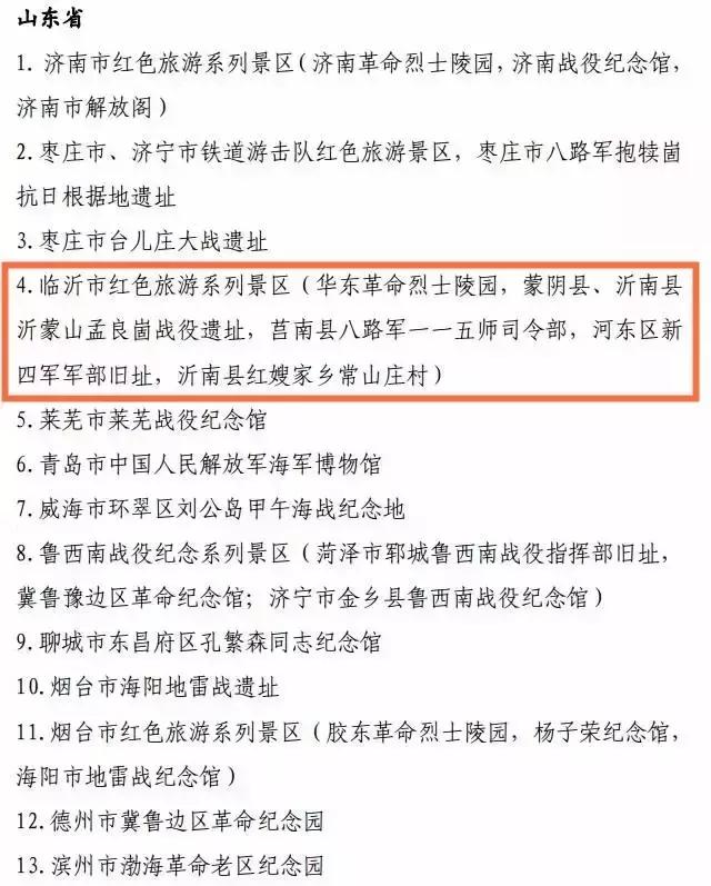临沂,沂蒙精神的发源地,如今有五个红色景区成为“全国经典”,在《全国红色旅游经典景区名录》中有300个景区成为红色旅游发展工作的重点支持对象,其临沂的中华东革命烈士陵园、孟良崮战役遗址、莒南八路军一一五师司令部、河东区新四军军部旧址、沂南沂蒙红嫂家乡常山庄村等名列其中。